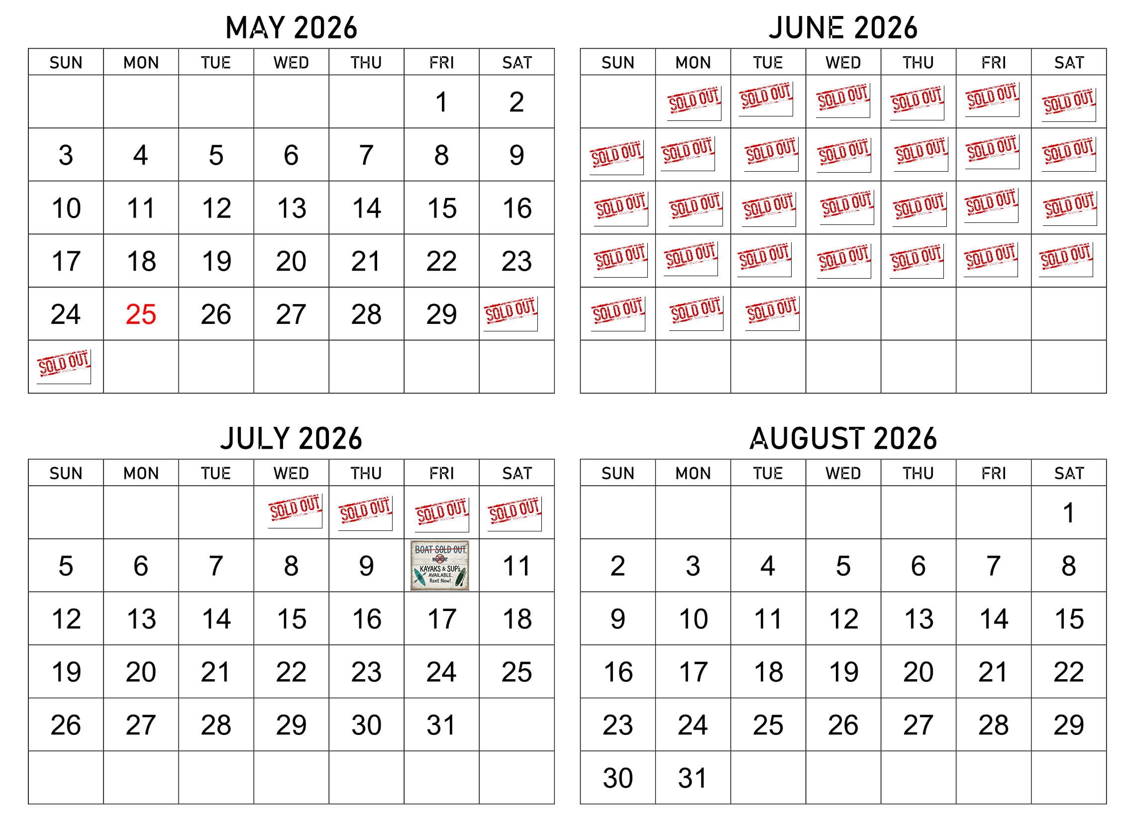 Now accepting reservations for the Summer. Our calandar of availability is updated as fast as we are able, but there may be a delay between accepting a reservation and updating this calander. Please text or call for the latest availability (208) 646-8527.